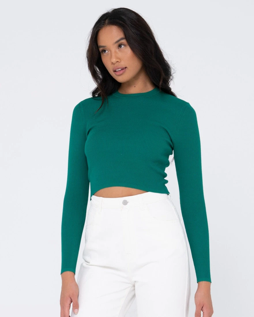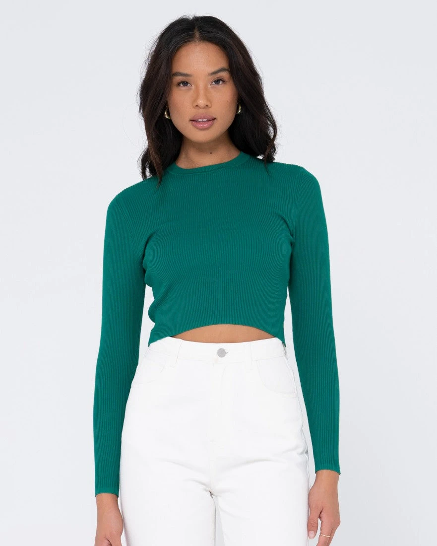 Slim Fit Long Sleeve Ribbed Knit Crop Top. Material: 72% Viscose 28% Polyester Knit
